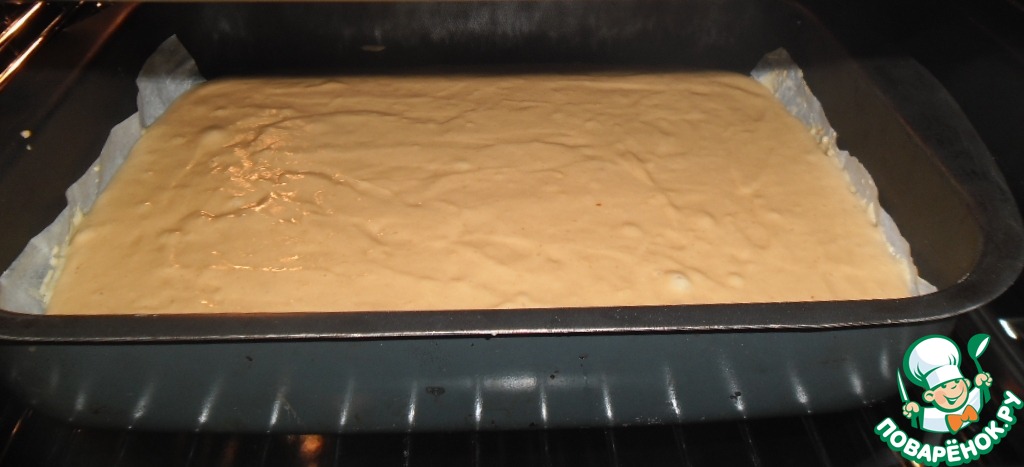 и выложить в форму, смазанную маслом, или выстеленную промасленным пергаментом. Выкладывать ложкой и помогать лопаточкой. Выпекать при t 180 градусов, 25-30 минут (в зависимости от возможностей вашей духовки). Вначале кажется, что тесто очень густое, вязкое и не примет форму, но нагреваясь оно растеклось и приняло нужные размеры. У меня прямоугольная форма 24 см х 31 см.