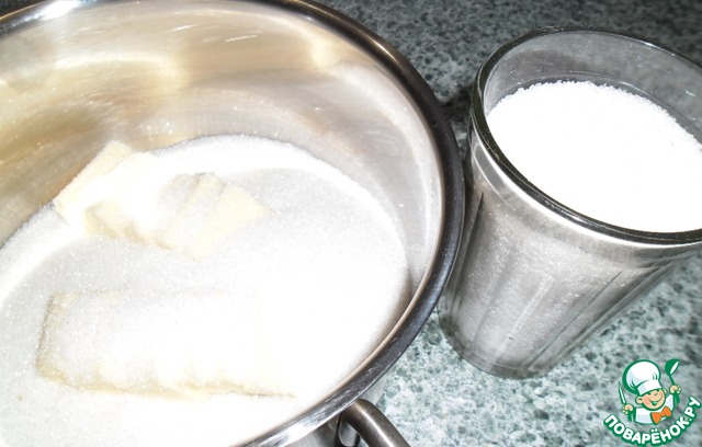 Заранее приготовьте все продукты по списку. 125 г сливочного масла соединить с 12 ст. л. сахара. У меня тростниковый сахар Демерара от ТМ Мистраль в кубиках (т. к. не нашла другого), поэтому я кубики растолкла скалкой. Перетереть масло с сахаром до однородности.