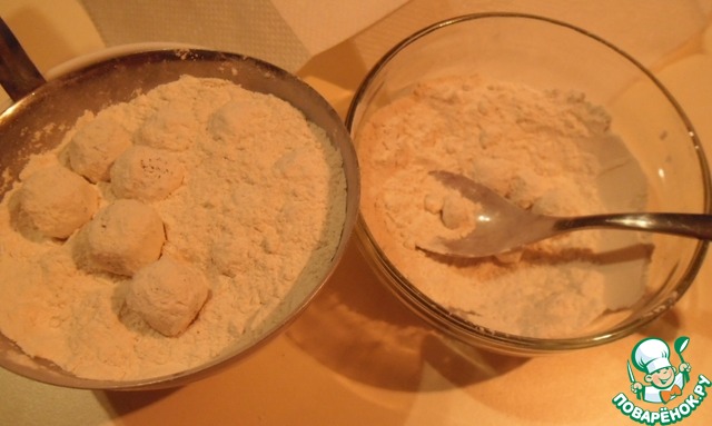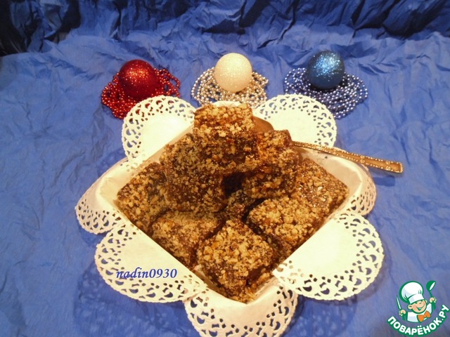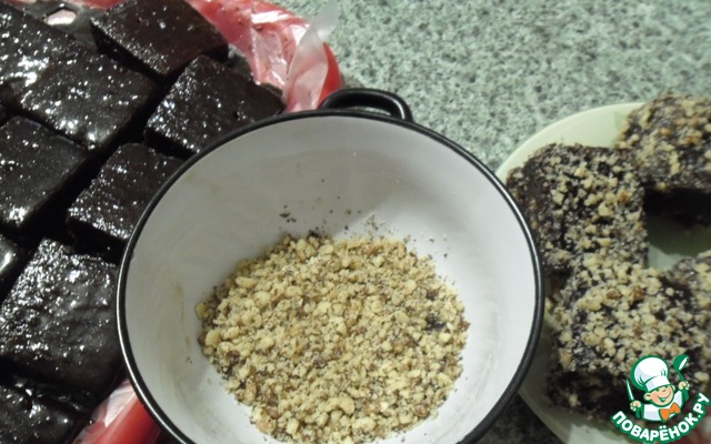 Затем обваливаем кусочки выпечки в измельченных орехах (я растолкла их скалкой)