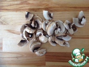 • Грибы почистить, помыть и обсушить. Ножки грибов мелко порезать, шляпки нарезать крупными ломтиками