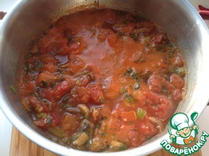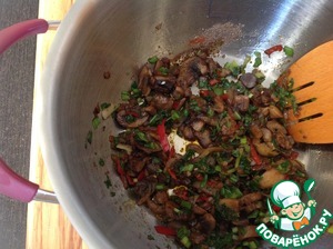• В кастрюлю добавить примерно 1 стакан нарезанных грибов (ножки и мелкие кусочки). Тушить грибы до выпаривания всей жидкости.