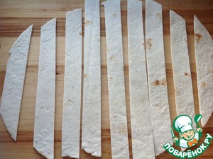 • Тортилью нарезать на полоски шириной 2 см. Подсушить на сухой сковороде с обеих сторон.