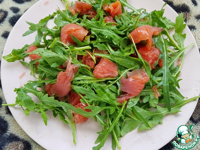 Приготовить заправку из оливкового масла и выжатого из грейпфрутовых долек сока. Полить салат.