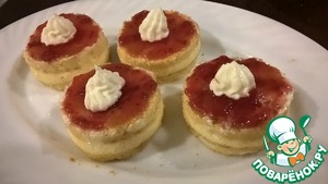• Сверху пирожные смазать клубничным джемом и украсить кремом