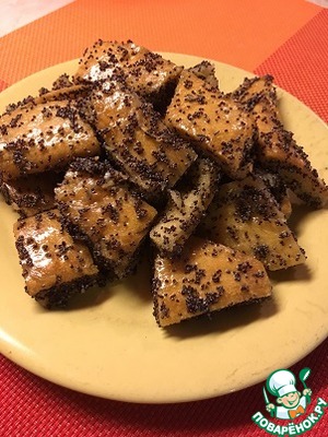 Каждый кусочек пропитывается горячим медом и покрывается маком. Это очень вкусно!