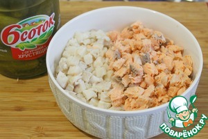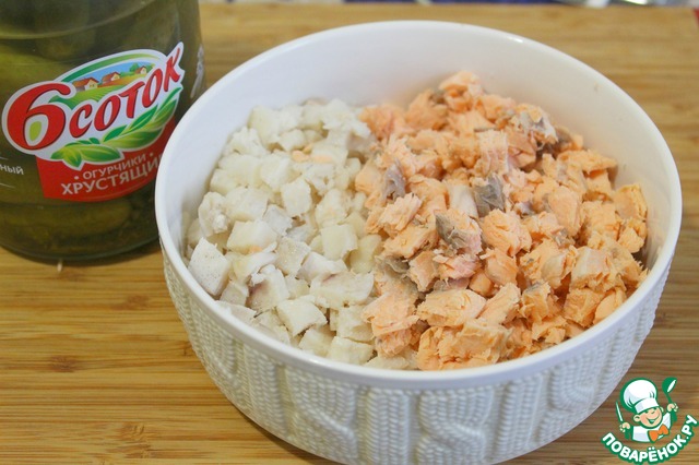 Оба вида рыбы нарезать небольшими кусочками.