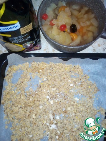 Для этого смешать злаковые хлопья и орехи с сахаром, добавить порезанное кубиками сливочное масло и растереть в крошку. Получившуюся крошку разложить на противень и подсушить при 180 градусах 5-10 минут.