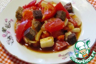 Помидор надрезать крестом, залить кипятком, оставить на пару минут, слить кипяток, залить холодной водой. Снять кожицу, удалить семена и нарезать кубиками.