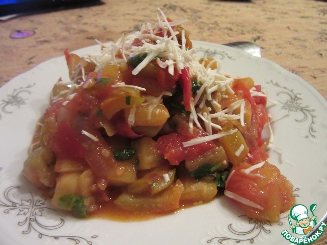 Лук обжарить в оливковом масла на среднем огне. Добавить перец болгарский, чеснок и черец чили. Обжарить коротко, добавить баклажан.