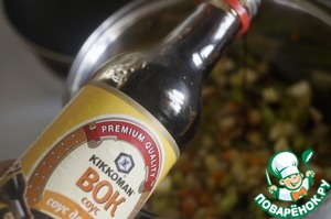 Влить соевый соус к овощам и тушить еще около 3 минут на слабом огне.