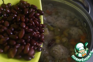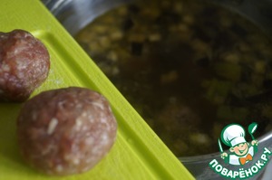 Влить в овощи воду и поместить фрикадельки. Дождаться когда они всплывут и убрать появившуюся пенку.