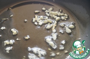 Для томатной заправки нагреть сковороду с маслом и спассеровать измельченный чеснок.