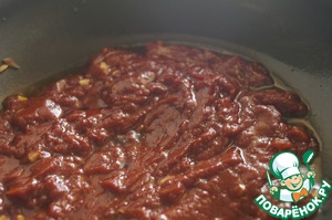 Добавить томатную пасту, приправить кориандром и готовить помешивая 3 минуты.
