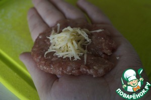 Отщипнуть немного фарша и сформировать лепешку. В середину поместить немного сыра.