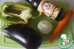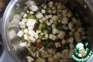 Нарезать кубиков болгарский перец и баклажан. Выложить в кастрюлю к пассерованным овощам. Готовить помешивая 3 минуты.