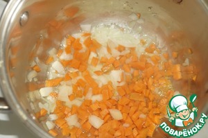Небольшими кубиками нарезать лук и морковь. В кастрюле разогреть немного растительного масла и выложить лук с морковью, спассеровать до мягкости.