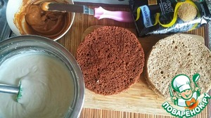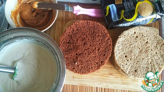Коржи разделить на 2-3 части, зависимо от того в форме какого диаметра они выпекались. Собирать торт, щедро смазывая сметанным кремом, чередуя шоколадный и ореховый коржи, а также каждый пропитать кофе и чаем, соответственно цвету. Заполнить кремом все пустоты по бокам.