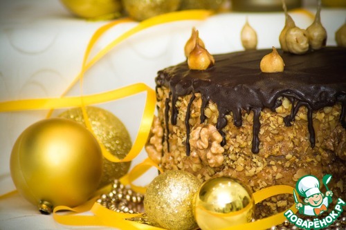 Шоколад с маслом растопить на водяной бане, дать немного остыть и покрыть им торт сверху, делая потёки. Далее украсить орехами в карамели и отправить в холод на несколько часов.