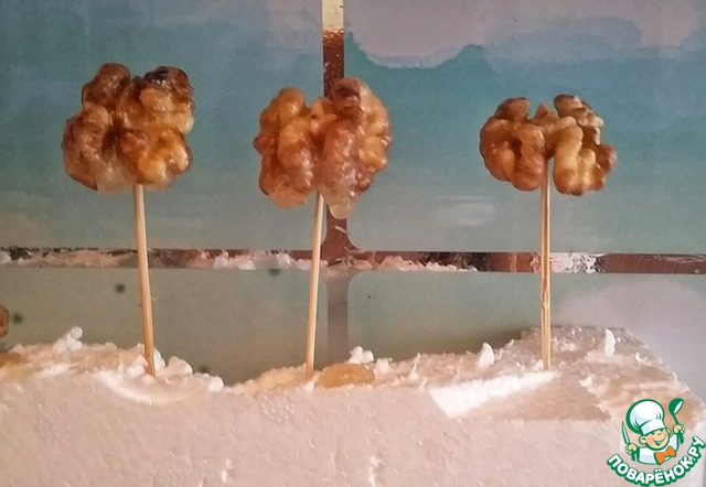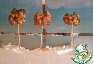 Грецкие орехи, каждый, быстро окунуть в карамель и выставить на подставку или на фольгу. -