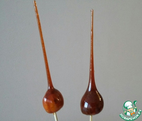 Весь секрет в густоте (температуре) карамели. Сначала она может стекать каплями, тогда окуните орех еще раз. В какой-то момент карамель станет тянуться хвостиком, его можно подрезать.
