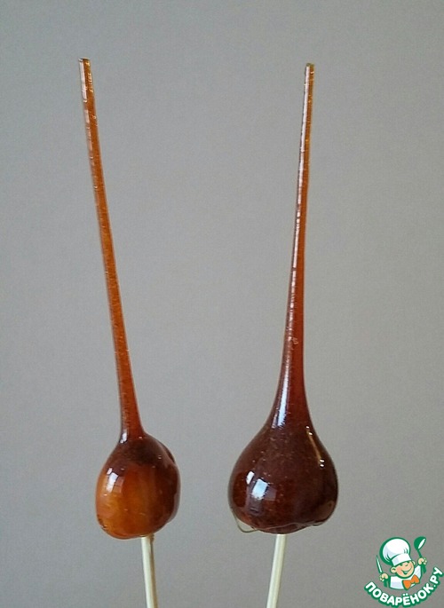 Насадить каждый орешек на зубочистку. Сварить темную карамель в сотейнике с толстым дном. Сначала она засахарится, но продолжайте варить, помешивая, вскоре она станет глянцевой и красивой.