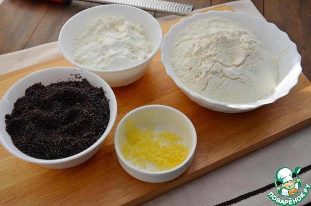 Мак промыть, дать воде стечь, просушить. Смолоть на кофемолке. Возможно у вас мак который не нужно будет мыть. Муку смешать с солью, разрыхлителем, просеять. Натереть с одного лимона цедру. Творог протереть через сито или размять вилкой.