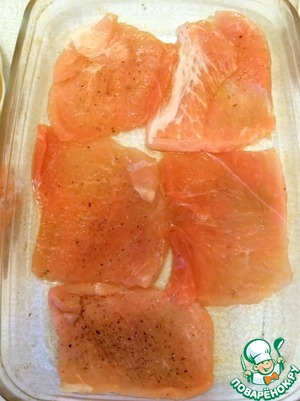 Запекать в горячей духовке при 180*С примерно 30 мин. Все зависит от толщины и качества мяса. Оно должно свободно протыкаться зубочисткой.