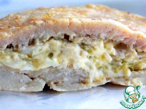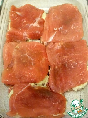 Положить остальные куски, по одному, поверх начинки и прижать немного мясо по краям. Намазать верх майонезом.