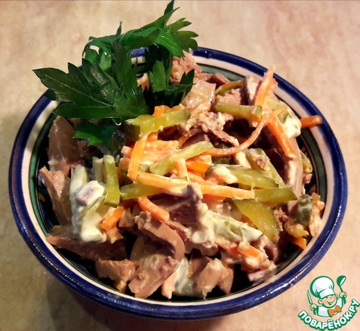 Смешать огурчики, печень и морковь по-корейски. Дать постоять 15-20 мин., еще раз перемешать, добавить сметану и подавать.