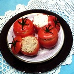 Наполняем, слегка утрамбовывая, половину помидоров одной начинкой, а другую половину - второй. Охлаждаем около часа в холодильнике и подаем...