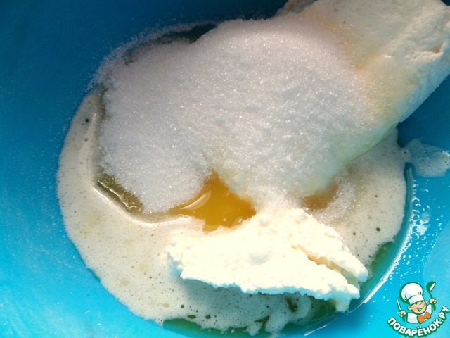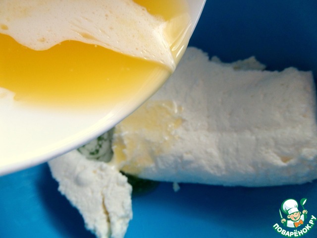 Вливаем растопленное масло в пачку творога.