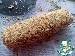 Обвалять в измельчённых орехах, завернуть не туго в плёнку и убрать на ночь в холодильник.