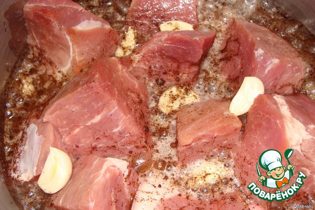 Сложить в кастрюлю, добавить 1 ч. л. натурального кофе, чеснок, перец, лавр. лист