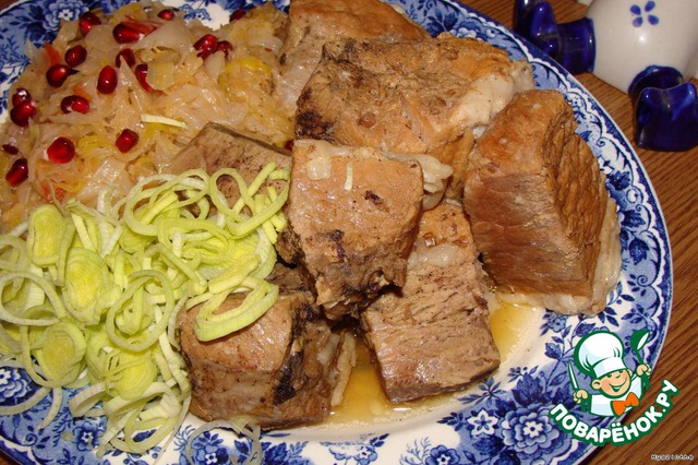 Идеальное сочетание с тушеной кислой капустой с яблоками и запивать пивом. Мммммм... Вкуснооооо! Отдельно в соуснике подать соус от мяса.