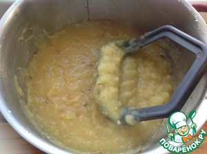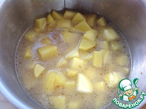 Как только картофель сварится, кастрюлю снять с огня и пюрировать толкушкой, особо не усердствуя. Консистенция супа должна остаться с небольшими кусочками картофеля.