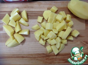 Картофель очистить от кожуры. Нарезать на мелкие и крупные ломтики.