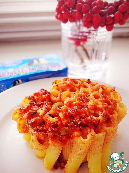 Затем на соус ставим макароны, начиная с центра. Сверху выкладываем соус.