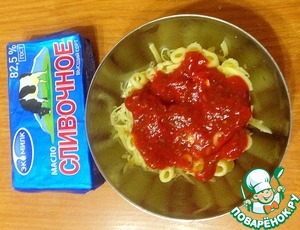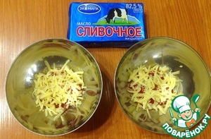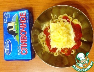 Поверх соуса кладем 10 гр. (на порцию) сливочного масла. У меня 82,5% ТМ Экомилк. И присыпаем сыром.