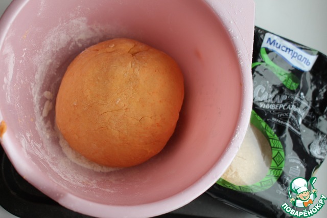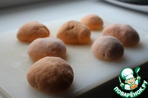 Разделить на 7 частей весом ок. 70 г. Взять порцию теста, тщательно припылить ее мукой...