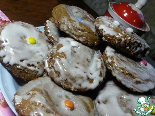 Выложить сформованные пряники на противень, застеленный бумагой для выпечки, и готовить в духовке, разогретой до 200° в течение 20 минут. Пока пекутся пряники, сделать глазурь. Для этого смешать воду с сахарным песком и довести сироп до кипения. Горячей глазурью покрыть горячие пряники.