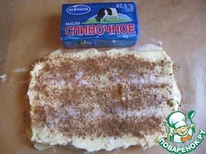 Тесто раскатываем в пласт 20х30 см, в центр кладем поперек масло, насыпаем 1/3 сахара и накрываем с двух сторон концами теста. Раскатываем скалкой и на 1 час в холодильник.