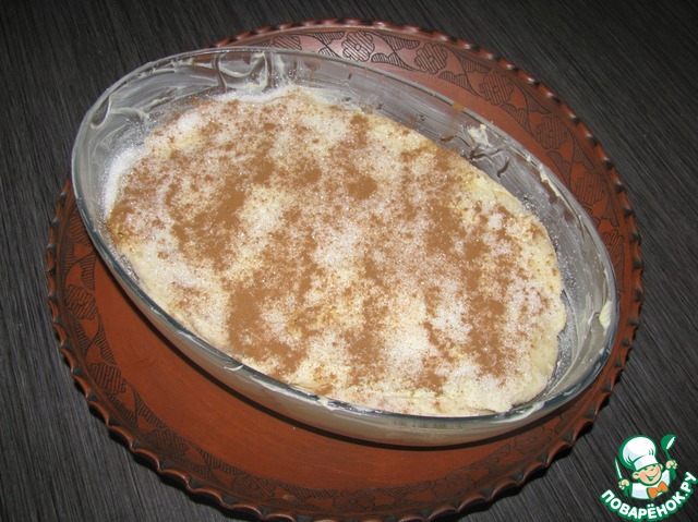Формируем лепешку под форму для выпечки – у меня овальная. Закладываем в смазанную маслом форму. Сверху смазываем растопленным маслом, посыпаем 2-мя столовыми ложками сахара и небольшим количеством корицы.