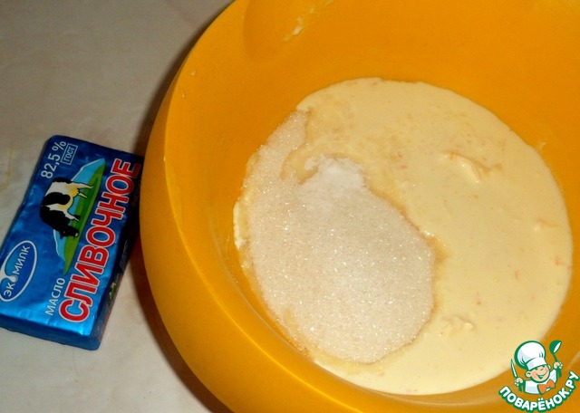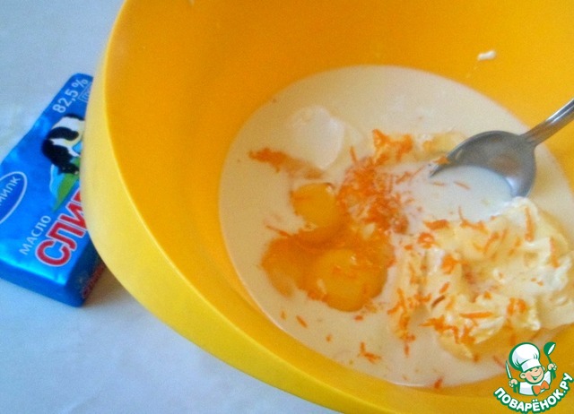 В миску выливаем молоко, добавляем сметану, яйца, цедру апельсина и размягченное сливочное масло ТМ "Экомилк". Тщательно все перемешиваем ложкой.