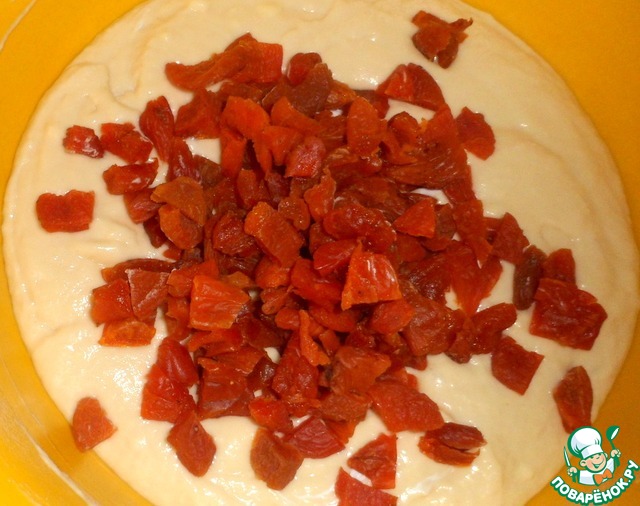 Нарезать курагу и добавить в тесто, перемешать.
