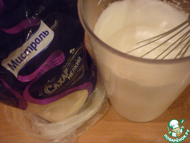 Белки взбить до пиков, всыпать 60г сахара и взбить до твёрдых пиков.