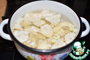 Капусту разделить на соцветия, выложить в кастрюлю, добавить нарезанный чеснок и картофель. залить водой (на 2 порции супа) и варить при слабом кипении 15 минут.