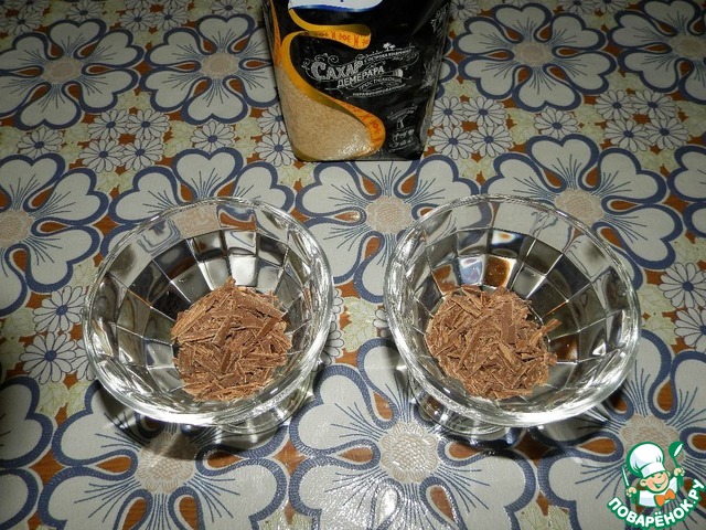 30 грамм шоколада порезать ножом и разложить в две креманки.