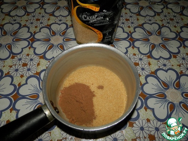 В металлическую посуду всыпать сахар, какао и корицу. Перемешать.