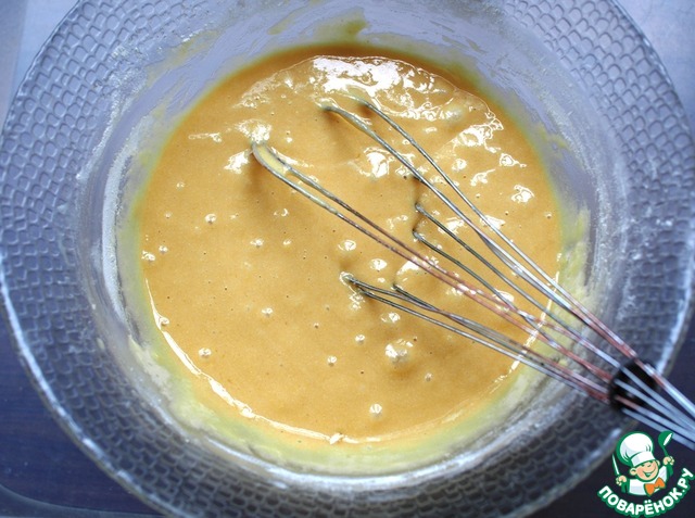 Порциями постепенно всыпать пшеничную и кукурузную муку и тщательно перемешать до однородной консистенции.