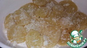 Выкладываем картофель в форму (стенки и дно заранее мазать растительным маслом) в 2-3 слоя, каждый слой пересыпая сыром, слегка посолить.